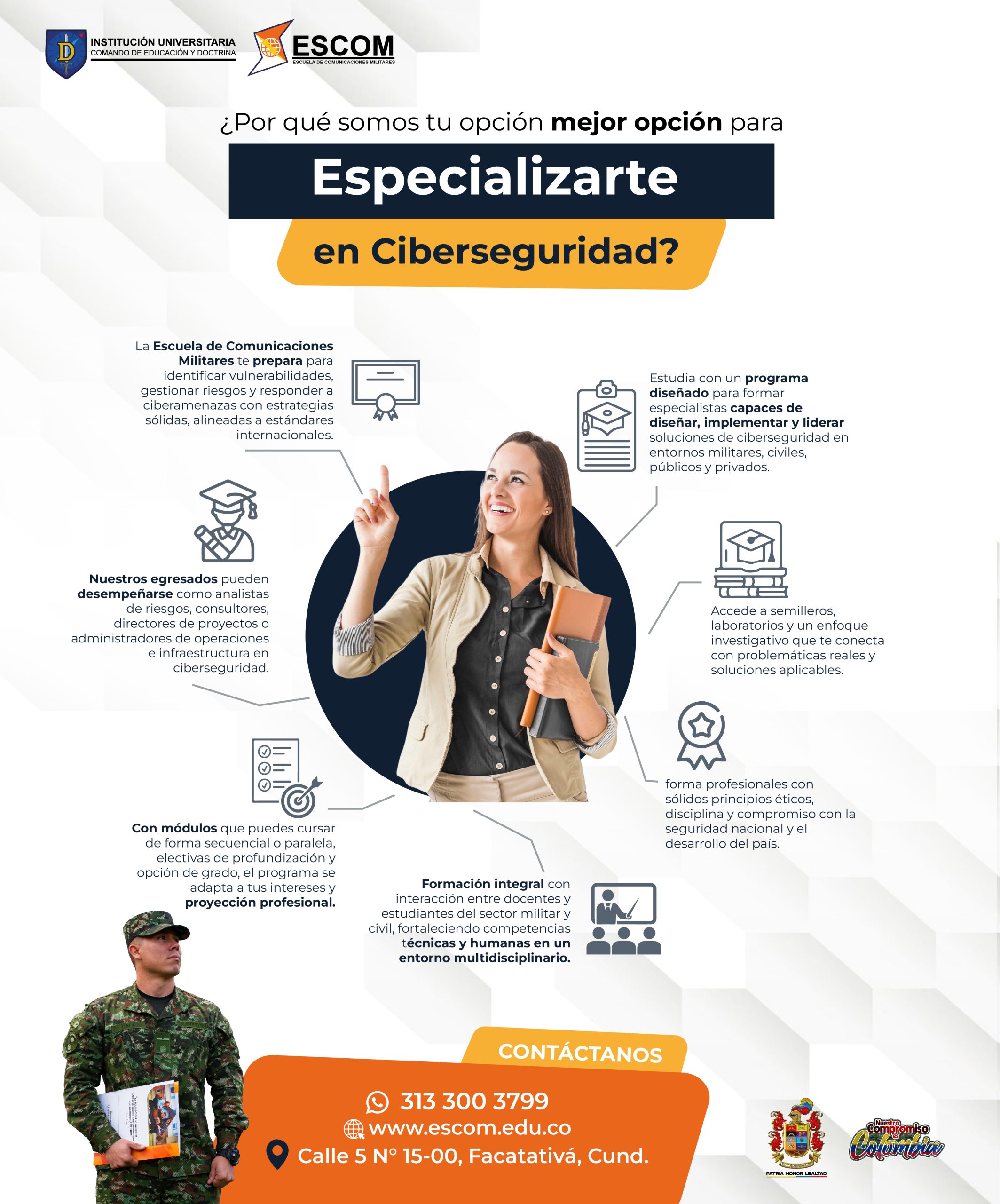 Dirigido a: La especialización en Ciberseguridad está dirigida a miembros de las fuerzas armadas con formación profesional en áreas afines a la ciberseguridad, así como a personal civil con estudios de pregrado en ingeniería y profesionales afines con conocimiento de conceptos básicos de seguridad de la información, que deseen profundizar en la planeación, diseño y aplicación de estrategias de Ciberseguridad en las organizaciones.