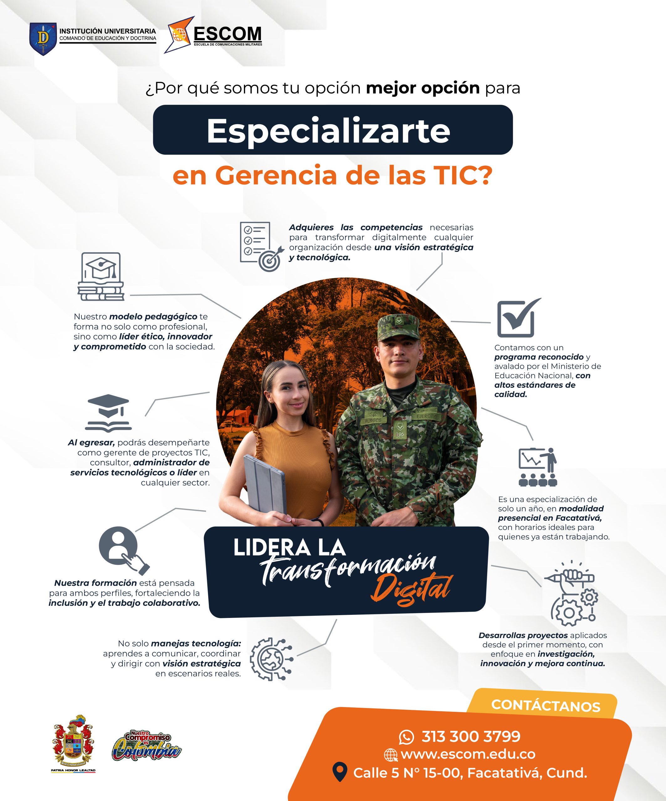 Dirigido a: Personal civil con formación universitaria de pregrado en las disciplinas: administración de empresas, economía, derecho, ingenierías, física, matemáticas y afines, o miembros de las Fuerzas Armadas de Colombia con formación profesional en las disciplinas de: administración de empresas, economía, derecho, ingenierías, física, matemáticas y afines. Adicionalmente, el aspirante debe contar con experiencia laboral en el ámbito de las TIC o con conocimientos demostrables (diplomados, cursos o similares) en fundamentos de las Tecnologías de la Información y las Comunicaciones.